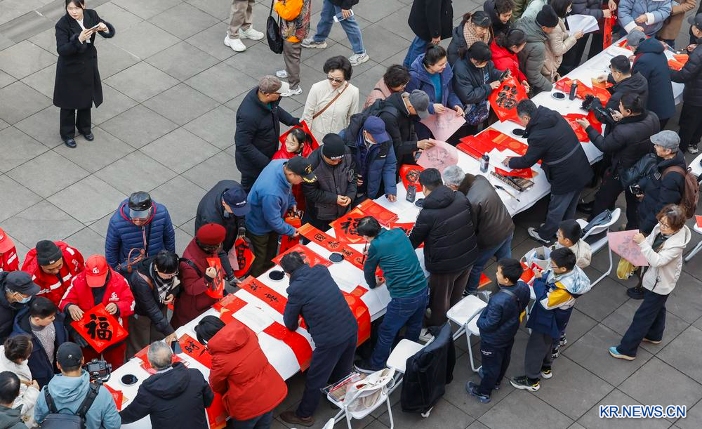4일 장쑤(江蘇)성 난징(南京)시 구러우(鼓樓)구 입춘 행사 현장에서 서예가들이 주민과 관광객을 위해 복(福)자와 춘련(春聯·춘절에 문이나 기둥에 붙이는 주련)을 썼다.