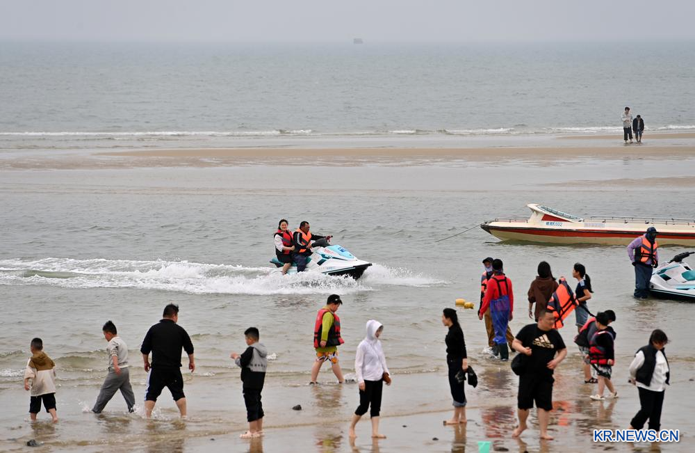 5일 관광객들이 광시(廣西)좡족자치구 베이하이(北海)시 해상에서 모터보트를 타고 있다.