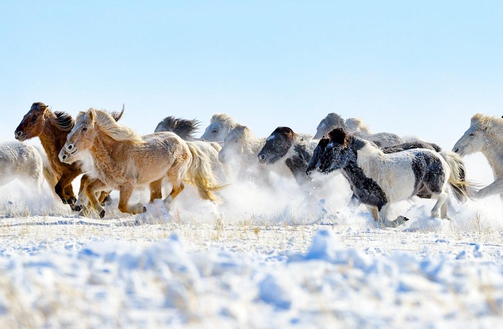 이날 네이멍구(內蒙古)자치구 시린궈러(錫林郭勒)맹 시린하오터(錫林浩特)시에 위치한 펑황마장에서 말 길들이기 행사가 열렸다. 설원에는 목축민과 함께 말들이 달리는 장관이 연출됐다. 2026.2.6