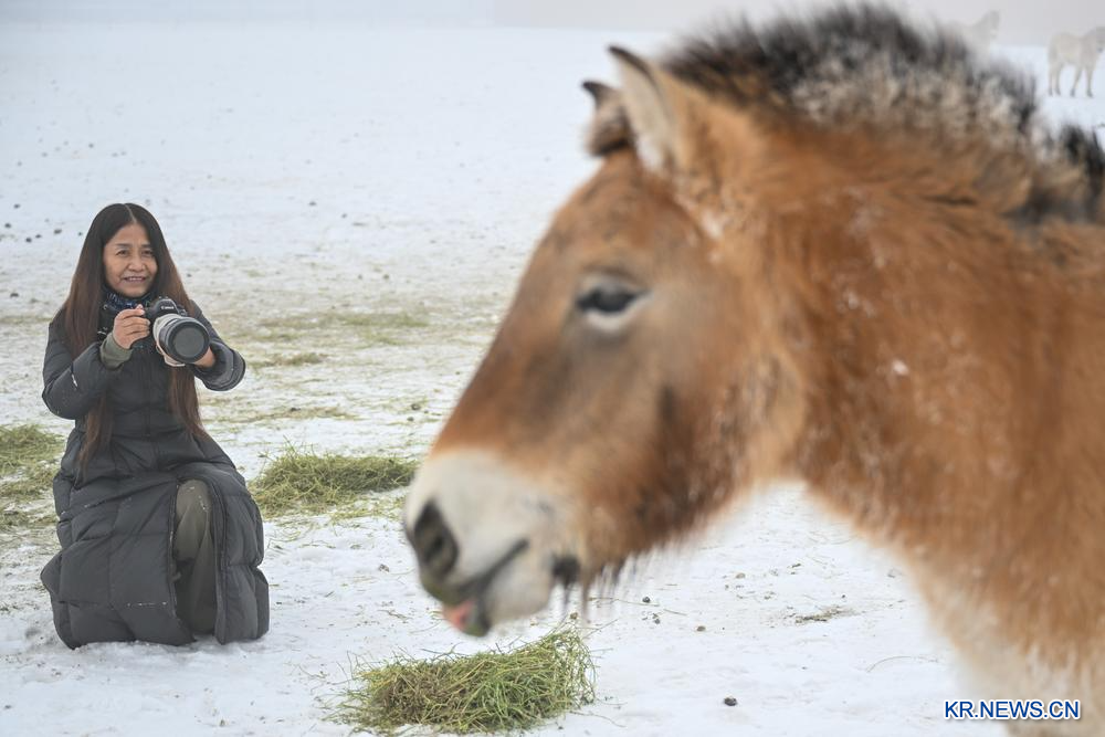 6일 신장(新疆)위구르자치구 카라마이리산(卡拉麥里山) 야생동물 자연보호구 관리센터의 야생마 번식 연구소에서 연구진이 야생마를 촬영하고 있다.
