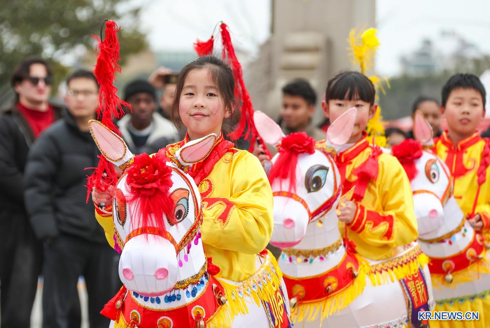 [신화망 중국 쥐룽 2월8일] 7일 장쑤(江蘇)성 쥐룽(句容)시에서 춘절(春節·음력설)맞이 용품 장터가 열렸다. 장터 현장에서는 사자춤 등 민속 공연이 펼쳐져 많은 시민들의 발길을 끌었다.