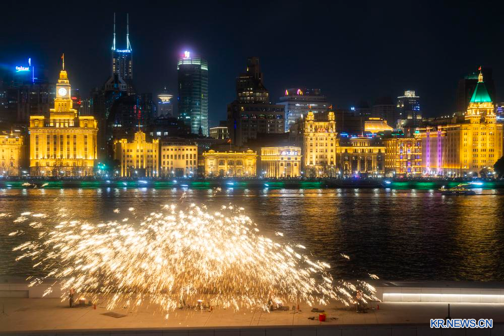 최근 상하이 푸둥(浦東)신구 황푸장(黃浦江) 강변에서 제1회 푸둥 춘절(春節·음력설)맞이 문화행사가 열린 가운데, 무형문화유산 타철화(打鐵花)가 어두운 밤 아름다운 풍경을 연출했다.
