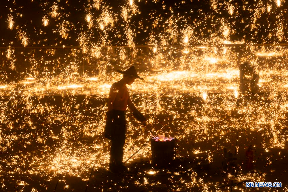 [신화망 상하이 2월9일]8일 민속 예술가가 무형문화유산 타철화(打鐵花) 공연을 선보이고 있다.