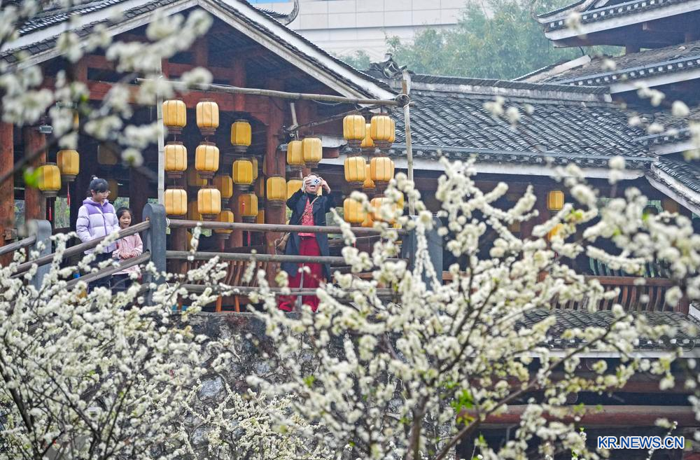 [신화망 중국 난닝 2월11일] 광시(廣西)좡족자치구 난닝(南寧)시에 위치한 광시 민족촌에 자두꽃이 만개했다. 빽빽하게 핀 흰 꽃이 목조 가옥과 어우러져 한 폭의 그림 같은 풍경을 연출했다.