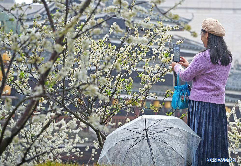 10일 관광객이 광시(廣西) 민족촌에서 자두꽃을 촬영하고 있다.