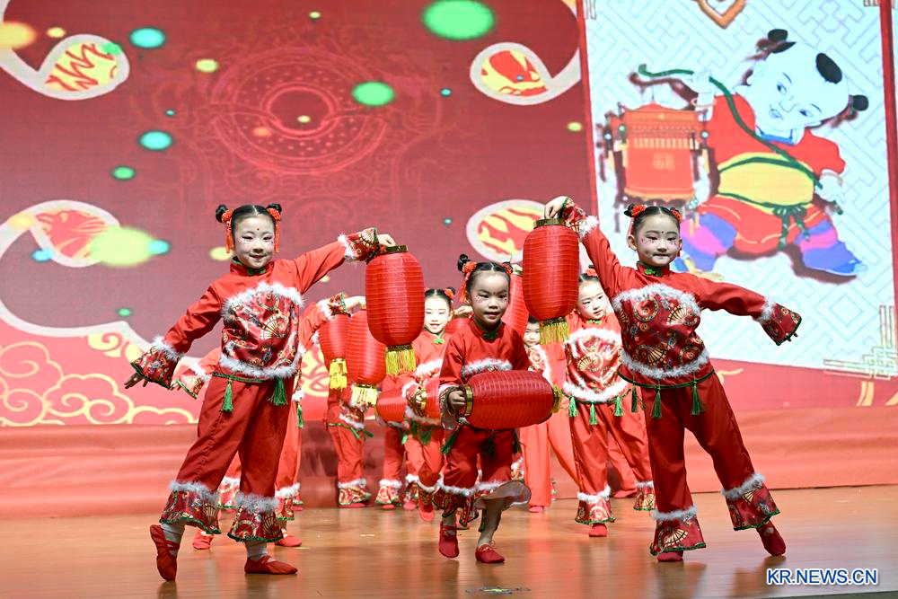 [신화망 중국 펑양 2월 11일] 10일 안후이(安徽)성 펑양(鳳陽)현 샤오강(小崗)촌 2025년 집체경제주식합작사 배당 대회에서 공연을 펼치는 어린이.