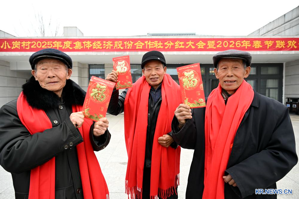 [신화망 중국 펑양 2월 11일] 10일 안후이(安徽)성 펑양(鳳陽)현 샤오강(小崗)촌에서 2025년 집체경제주식합작사 배당 대회가 열렸다. 샤오강촌은 9년 연속 배당금을 지급하고 있다.