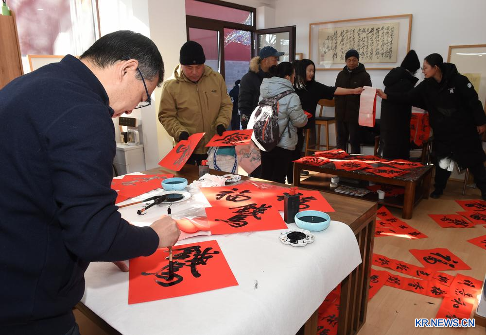 이날 서예가가 원명원 하이탕(海棠) 서원에서 방문객들에게 '복(福)'자와 춘롄(春聯·음력설 대문이나 기둥에 붙이는 글귀)을 써서 선물하고 있다. 2026.2.7