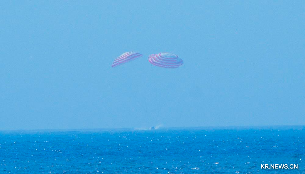 이날 '멍저우' 우주선의 귀환캡슐이 정해진 프로세스에 따라 예정된 해역에 안전하게 착륙하고 있다. 2026.2.11