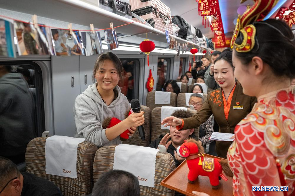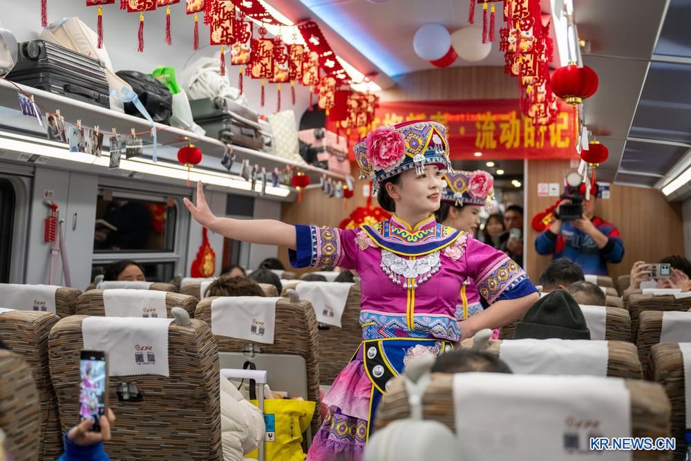 중국철로 우한(武漢)국그룹의 우한 여객운송 부서 D38편 승무원팀이 이날 열차에서 신년 친목 행사를 열었다. 현장에서는 춤, 색소폰 연주 등 다양한 공연이 펼쳐졌다. 2026.2.11