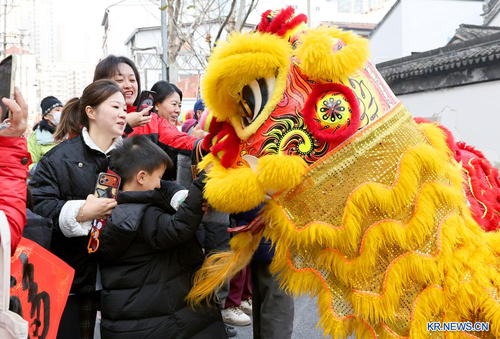 12일 상하이에서 열린 '제21회 라오시먼(老西門) 춘롄(春聯·음력설 대문이나 기둥에 붙이는 글귀)대회'에서 사자춤 공연단과 상호작용하는 관광객.