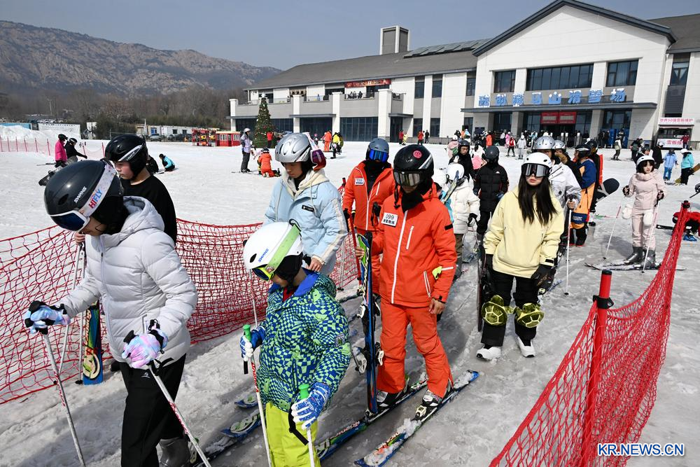13일 산둥(山東)성 칭다오(青島) 시하이안(西海岸) 룽촹(融創) 창마산(藏馬山)스키장을 찾은 관광객들이 스키를 타고 있다.