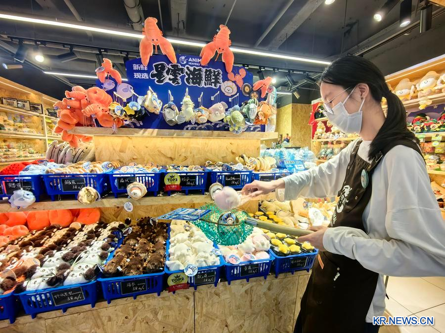 '둥우싱윈(動物星雲)' 바이롄ZX점에서 직원이 봉제인형 해산물을 건져 올리고 있다. (사진/신화통신)