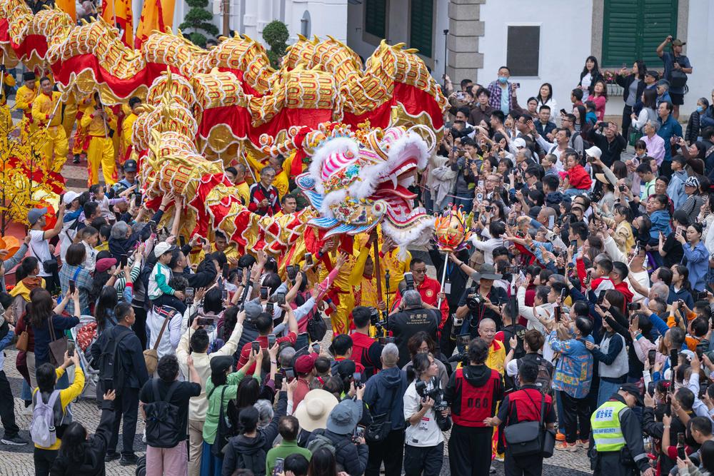 이날 마카오 세나도 광장 앞에서 공연을 하고 있는 용춤 공연 팀. 2026.2.17