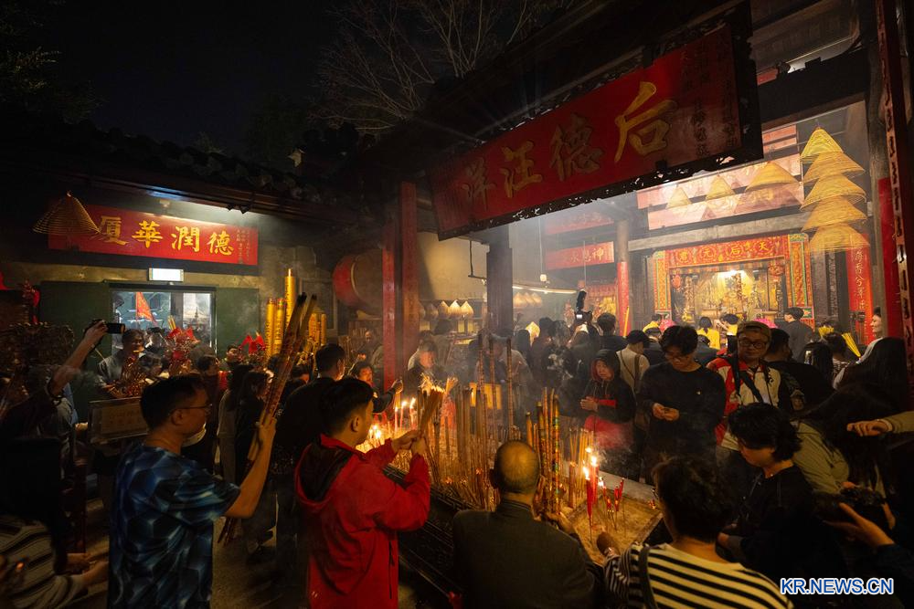 [신화망 중국 마카오 2월18일] 춘절(春節·음력설) 전날 밤 많은 마카오 주민이 아마사원(媽閣廟)에서 향을 피우고 복을 기원하며 말의 해를 즐겁게 맞이했다.
