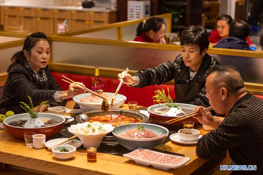 [신화망 중국 충칭 2월19일] 충칭(重慶)시 위중(渝中)구에 위치한 차오톈먼(朝天門) 훠궈 매장에 들어서면 이곳만의 창의적인 메뉴가 눈길을 끈다. 또한 쓰촨(四川)·충칭 지역 뱃사공 노래, 죽금(竹琴) 등 무형문화유산 공연도 펼쳐져 외국 방문객은 음식을 맛보며 현지 문화의 매력을 느낄 수 있다.