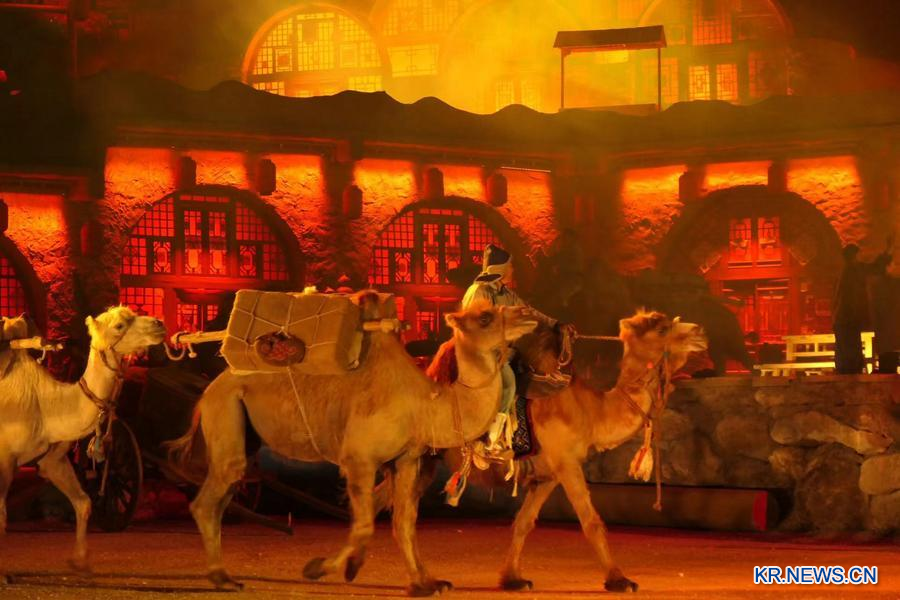 출발 구호와 함께 짐을 실은 낙타들이 역참 앞을 천천히 지나가고 짐을 멘 행상인과 손수레를 미는 장인들이 그 뒤를 따라간다. 역사 속에서나 존재했던 상인 행렬이 '모니산(莫尼山)' 무형문화유산 마을에 다시 등장한 것이다. 몰입형 실경 공연 '모니산 예찬'의 한 장면이다.