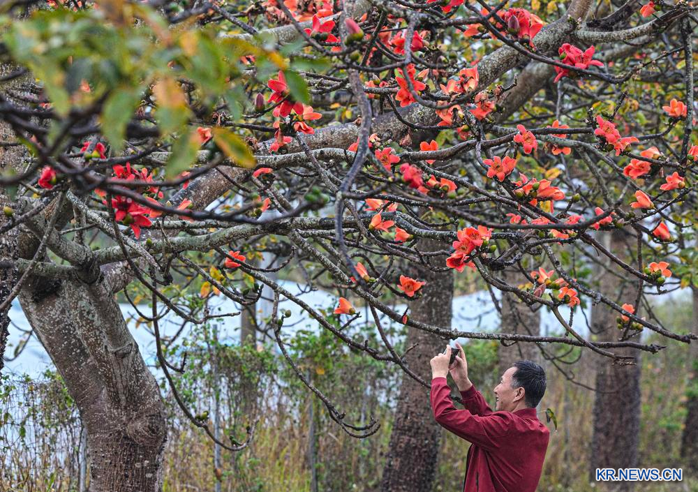 17일 하이난(海南)성 창장(昌江)리(黎)족자치현 우례(烏烈)진에서 관광객이 목면화를 카메라에 담고 있다.