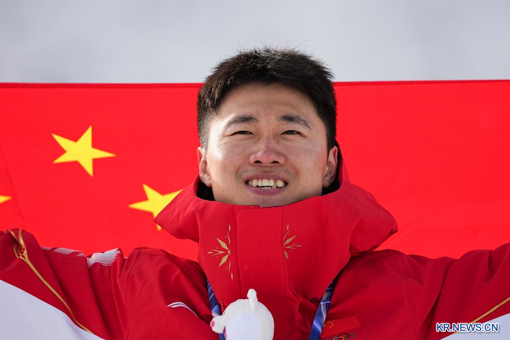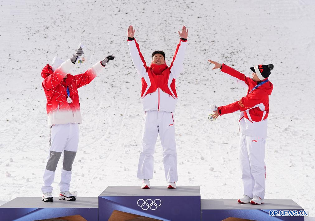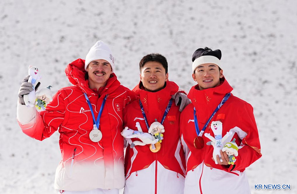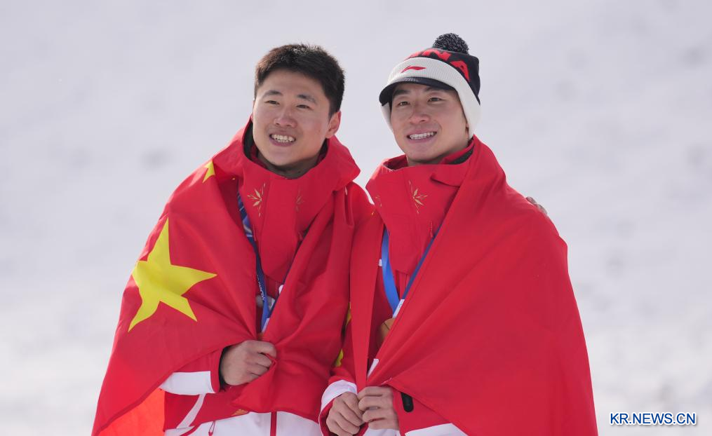 중국의 왕신디(王心迪) 선수와 리톈마(李天馬)선수가 20일(현지시간) 이탈리아 리비뇨에서 열린 밀라노-코르티나 동계 올림픽 프리스타일 스키 남자 에어리얼 결승에서 각각 금메달과 동메달을 목에 걸었다. [촬영/신화통신 기자 우후이워(邬惠我)]pagebreak