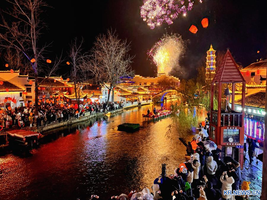 [신화망 중국 허페이 2월21일] 섣달그믐날 밤, 안후이(安徽)성 퉁링(銅陵)시 리차오수이(犁橋水)진에서는 화려한 불꽃놀이와 한푸(漢服)를 곱게 차려입은 관광객들이 등불 아래 골목을 거니는 풍경이 펼쳐진다.