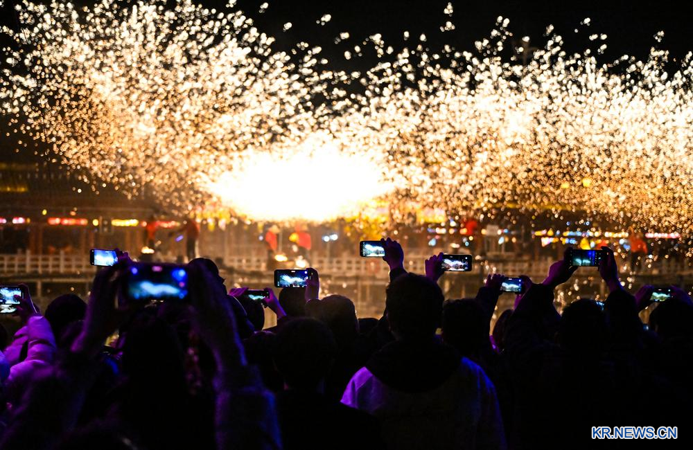 19일 허난(河南)성 상추(商丘)시에서 타철화(打鐵花) 공연을 관람하고 있는 관광객들. 2026.2.20