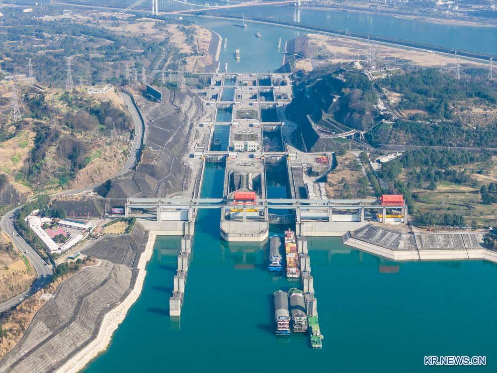 19일 후베이(湖北)성 이창(宜昌)시에서 선박들이 창장(長江) 싼샤(三峽) 쌍선(雙線) 5급 갑문을 통과하는 모습을 드론으로 내려다봤다. 2026.2.19