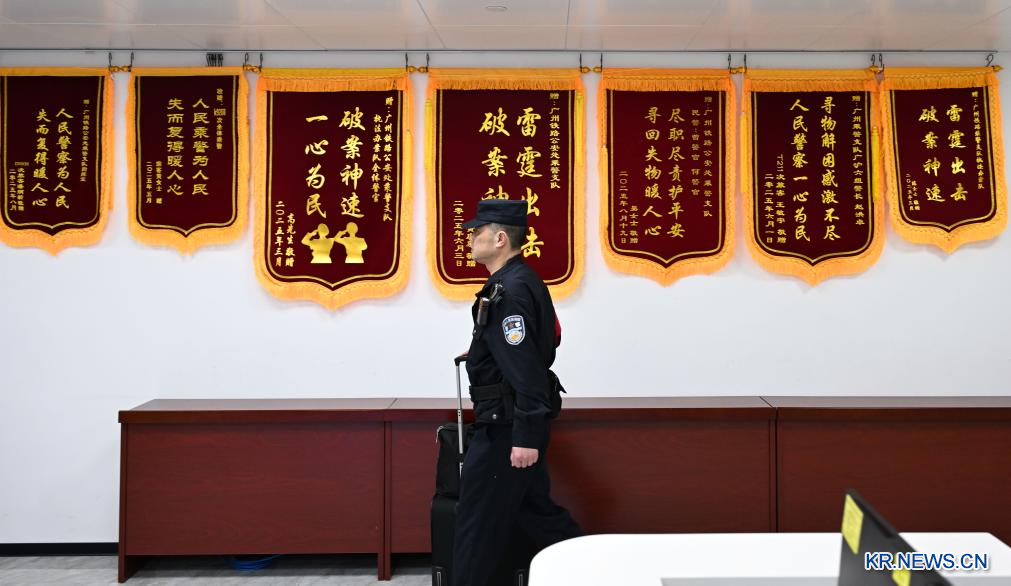 철도공안원 천젠쥔 씨가 11일 광저우 바이윈역 파출소에서 경찰용 장비를 받아 나가고 있다.