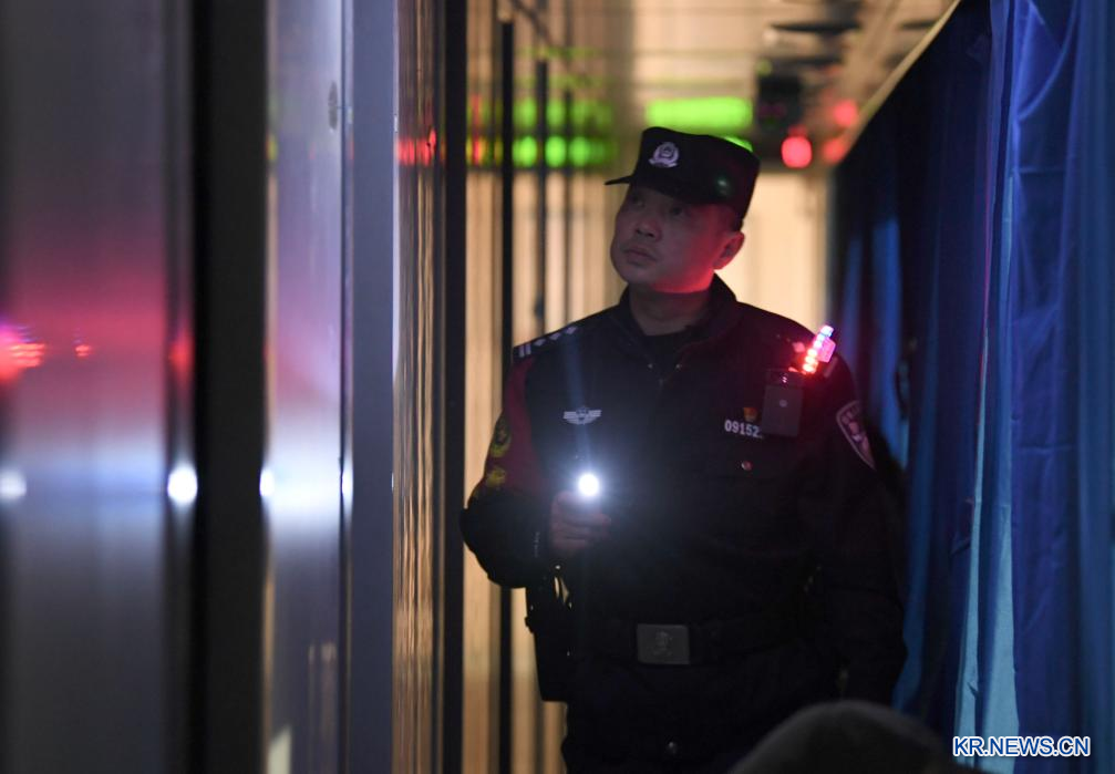 철도공안원 천젠쥔 씨가 11일 밤 광저우발 정저우행 Z4190번 열차 객실을 순찰하고 있다.