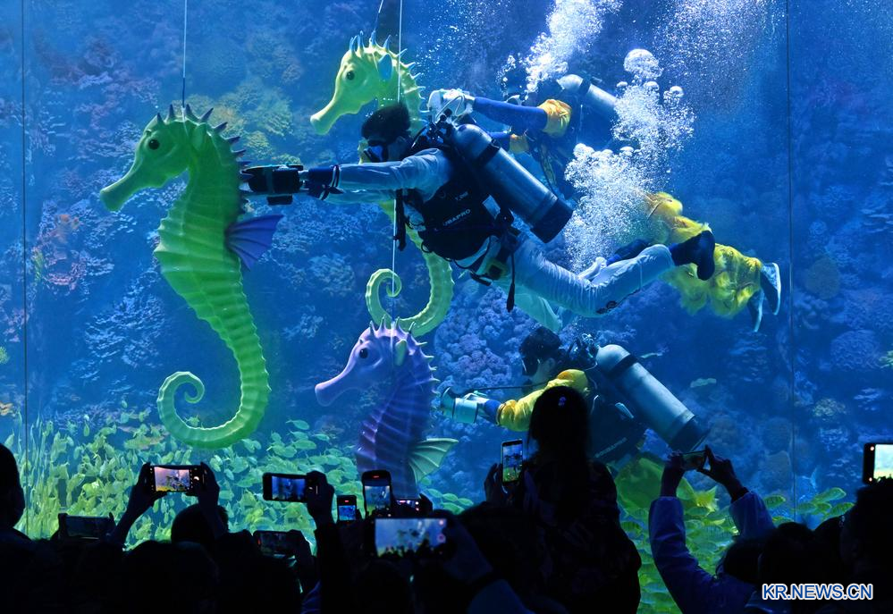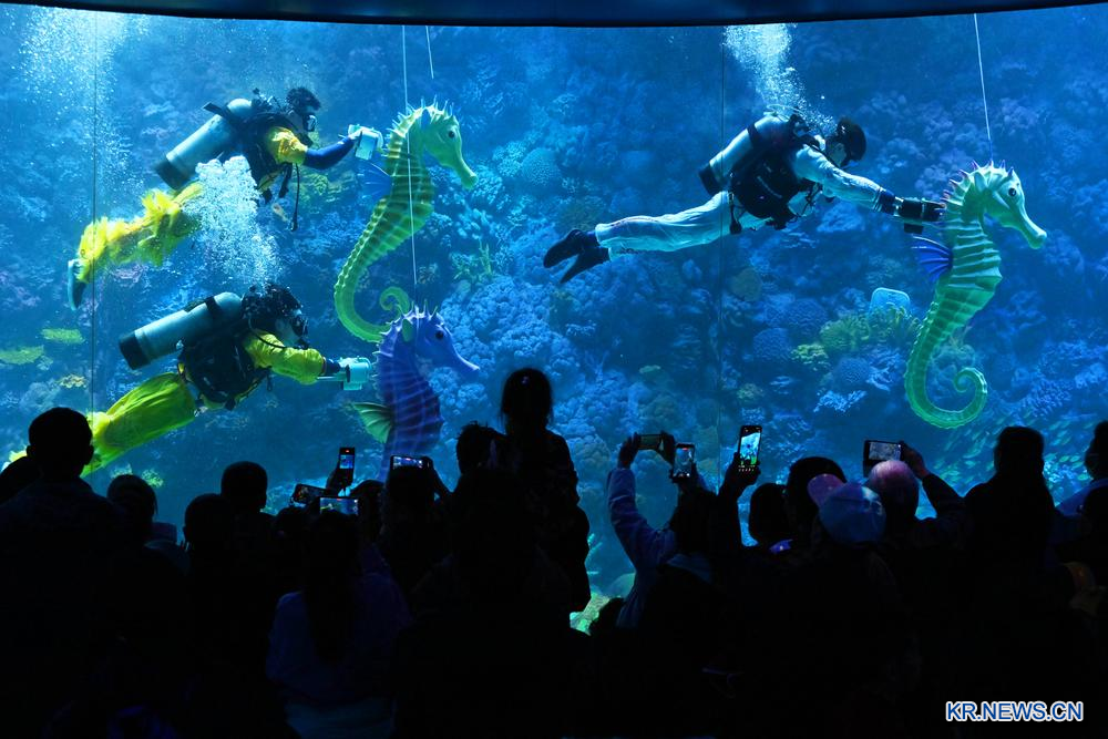 [신화망 중국 칭다오 2월23일] 춘절(春節·음력설) 연휴 기간 산둥(山東)성 칭다오(青島) 극지해양공원에서는 전통 풍습과 해양 특색 문화가 결합한 수중 '경마' 신춘(新春) 축하 공연이 펼쳐졌다. 다이버가 물속에서 서로 쫓고 쫓기는 공연은 관광객들에게 신선한 즐거움을 안겼다.