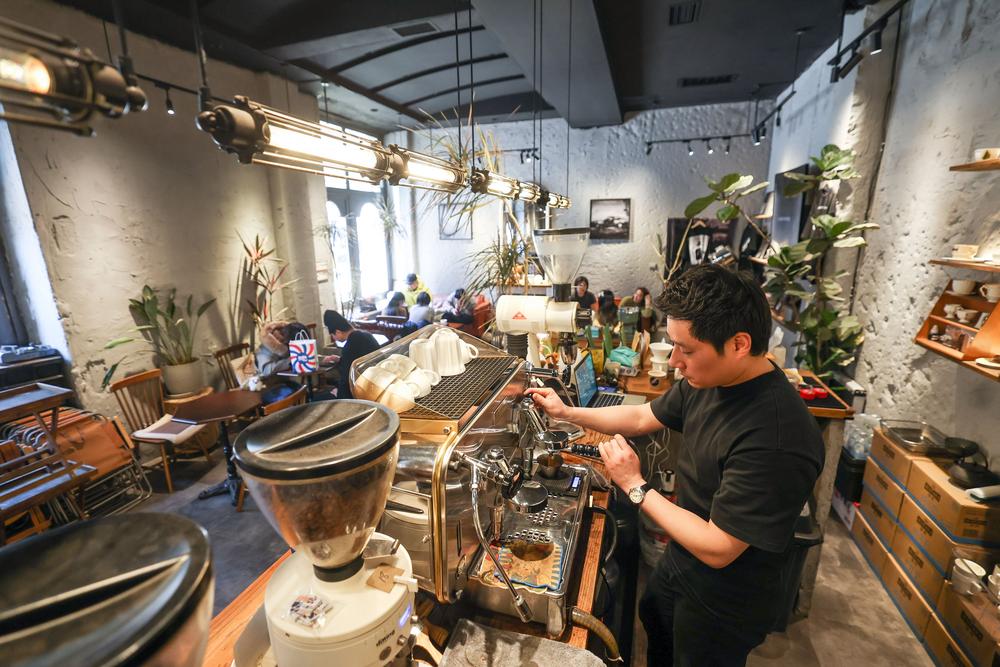 [신화망 중국 선양 2월24일]23일 랴오닝(遼寧)성 선양(瀋陽)시 바징(八經) 커피골목의 한 카페에서 커피를 만드는 직원.