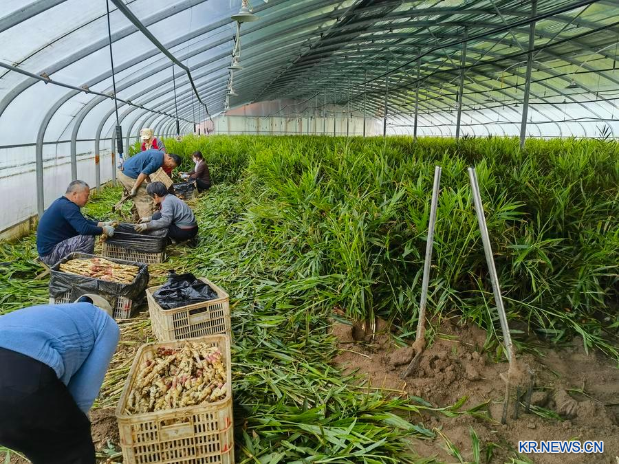 안추(安丘)시 스자좡(石家莊)촌의 고효율 농업 재배 시범 단지에서 생강을 수확하고 있는 농부들. (사진/신화통신)