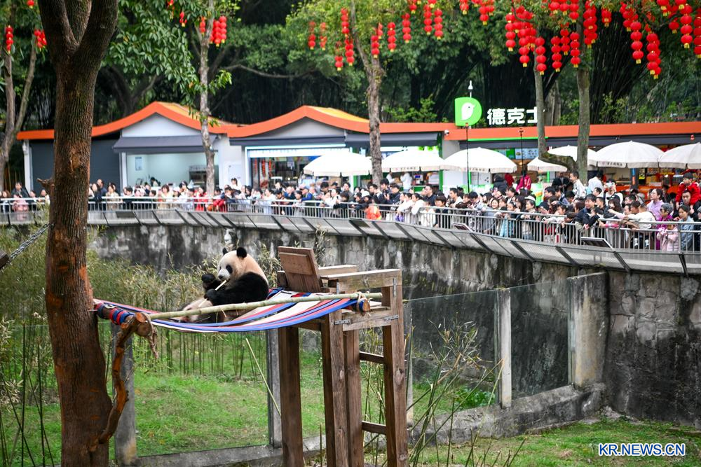 [신화망 중국 충칭 2월25일] 24일 충칭(重慶)동물원에서 10여 마리의 자이언트판다가 우리를 벗어나 따뜻한 햇살 아래 뛰놀며 많은 주민과 관광객의 발길을 사로잡았다.
