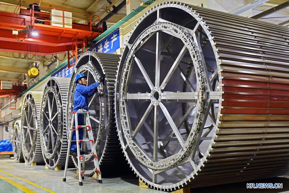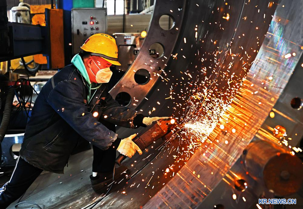 24일 장쑤(江蘇)성 롄윈강(連雲港) 경제기술개발구 중산(重山) 풍력발전설비회사 작업장에서 근로자들이 풍력발전 타워를 생산하고 있다.