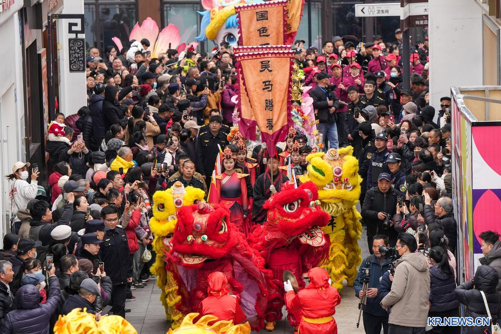 [신화망 중국 우시 2월26일] 25일 메이춘(梅村) 태백(泰伯) 묘회(廟會, 옛날부터 명절 때 절 부근에 임시로 서는 장터)에서 퍼포먼스를 선보이는 공연자들.