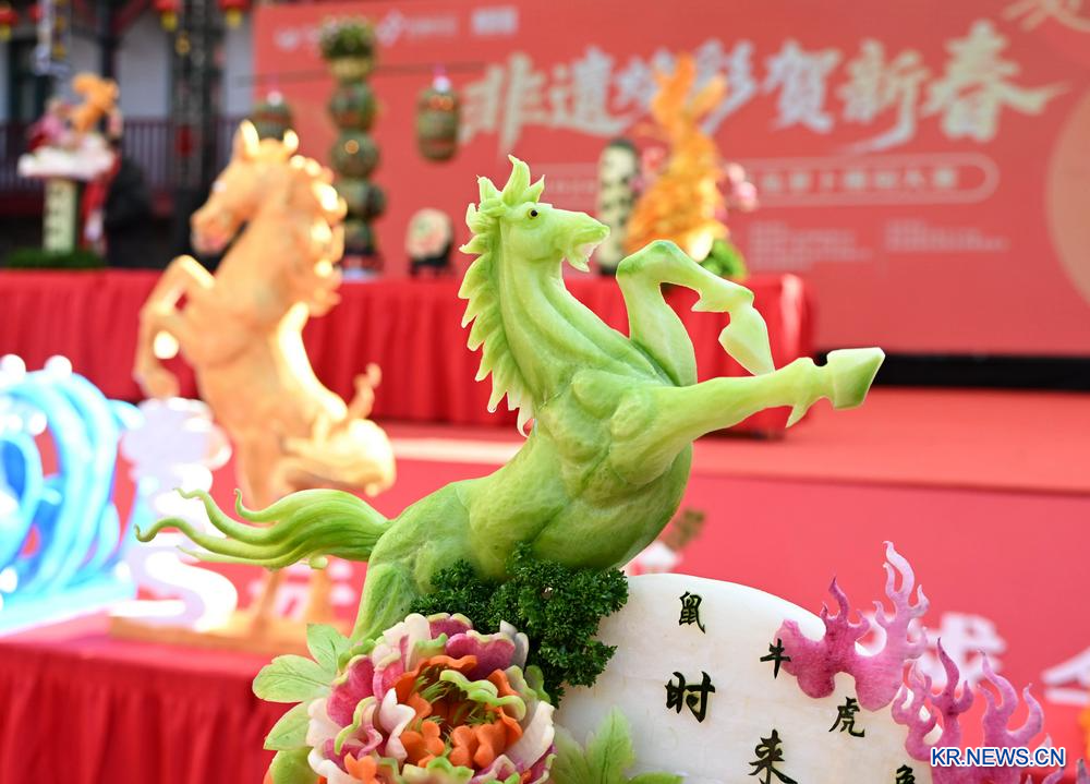 [신화망 중국 칭다오 2월26일] 25일 '2026년 칭다오(靑島) 무 조각 대회'가 산둥(山東)성 칭다오시 스베이(市北)구에서 열렸다. 현지 외식업계에서 온 30여 명의 식재료 조각 기술자들은 한데 모여 예술적 기예를 뽐냈다.