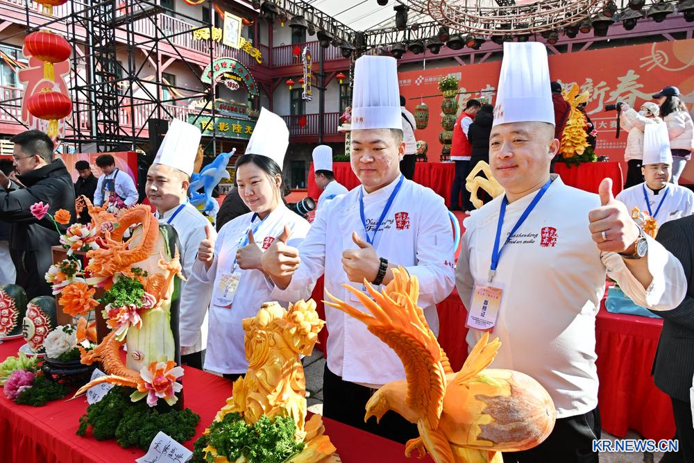 이날 '2026년 칭다오(靑島) 무 조각 대회'가 산둥(山東)성 칭다오시 스베이(市北)구에서 열렸다. 현지 외식업계에서 온 30여 명의 식재료 조각 기술자들이 한데 모여 예술적 기예를 뽐냈다. 2026.2.25