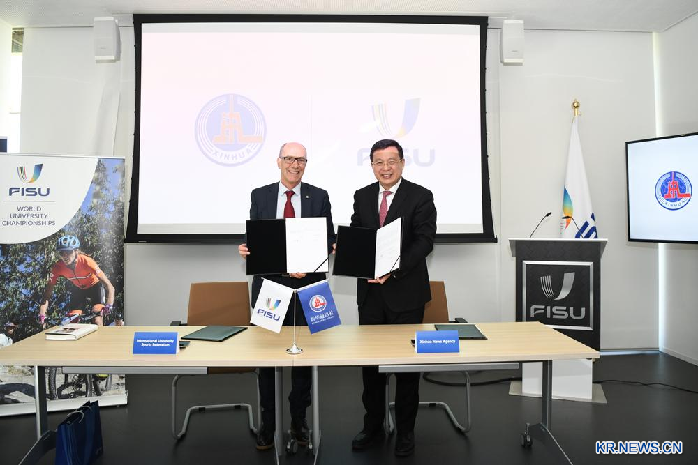 신화통신사와 국제대학스포츠연맹(FISU)이 25일 스위스 로잔에서 뉴스 협력 양해각서(MOU)를 체결했다. 이날 양해각서에 서명한 푸화(傅華) 신화통신사 사장과 레온즈 에더 FISU 회장이 기념사진을 찍고 있다. 2026.2.25