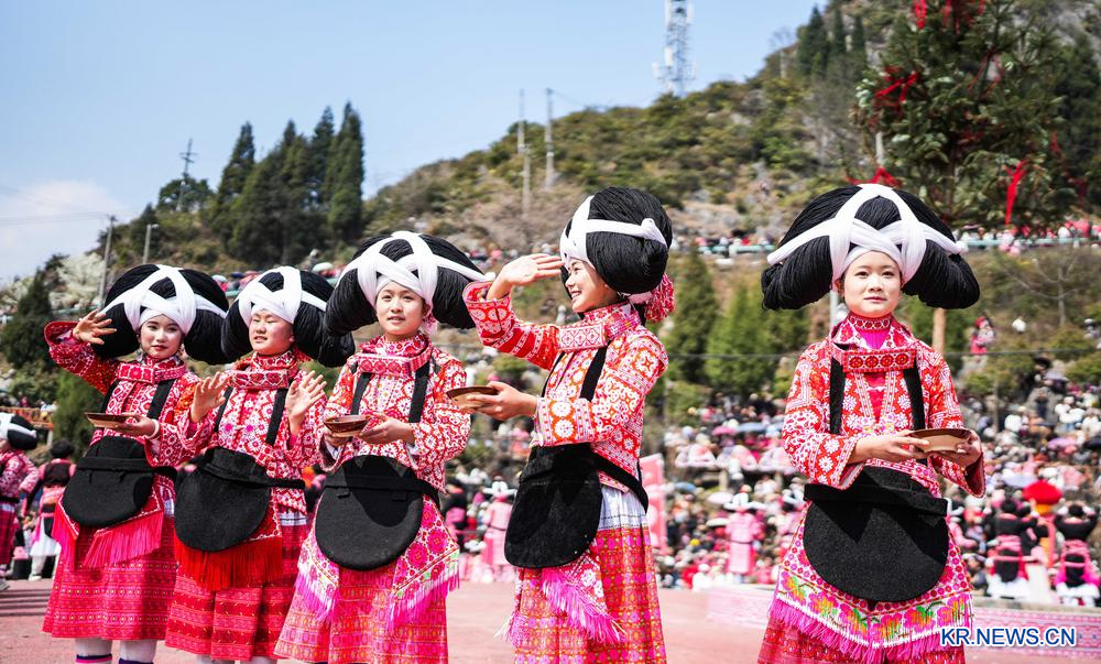 [신화망 중국 류판수이 2월27일] 음력 정월 초열흘인 26일 주변 지역에서 온 먀오(苗)족 군중과 여행객들이 구이저우(貴州)성 류판수이(六盤水)시에 있는 탸오화창(跳花場)에 모여 먀오족 전통 명절인 탸오화제(跳花節)를 함께 즐겼다. 탸오화제는 앞서 2008년 6월 제2차 국가급 무형문화유산 목록에 등재됐다.