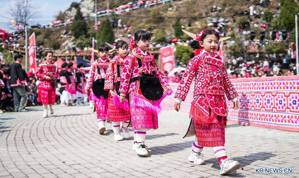 26일 중국 전통 복장을 입은 어린이들이 구이저우(貴州)성 류판수이(六盤水)시에 있는 탸오화창(跳花場)에서 퍼레이드를 하고 있다.