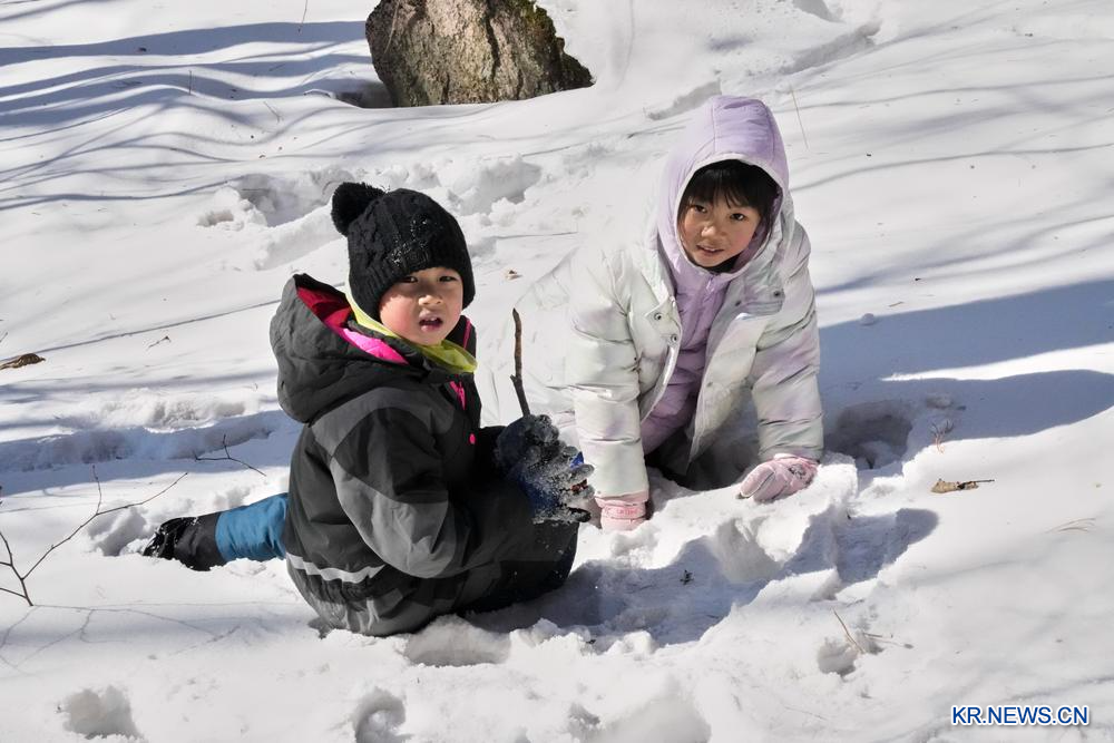 26일 헤이룽장(黑龍江)성 이춘(伊春)시 톄리(鐵力)시에서 눈놀이에 한창인 어린이.