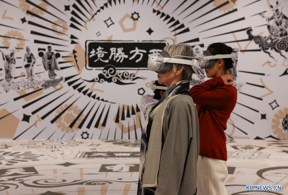 27일 베이징 국가전적(典籍)박물관을 찾은 관람객들이 가상현실(VR)을 체험하고 있다.