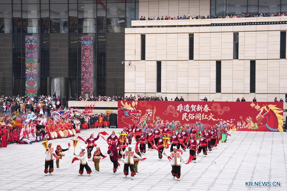 [신화망 베이징 2월28일] 중국공예미술관(중국무형문화유산관)과 중국공산당역사전람관이 공동 개최한 신춘(新春) 무형문화유산 민속 행사가 2월 28일 열렸다. 이번 행사에는 베이징·산시(陝西)·저장(浙江)·네이멍구(內蒙古) 등 지역에서 온 민속공연단이 참가해 기린춤, 죽마극, 마두금(馬頭琴, 멍구족의 현악기) 음악 등 14개 민속 공연을 선사했다.