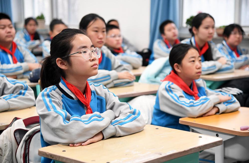 이날 베이징시 핑구(平谷)구 제1초등학교에서 학생들이 개학 첫 수업을 듣고 있다. 2026.3.2