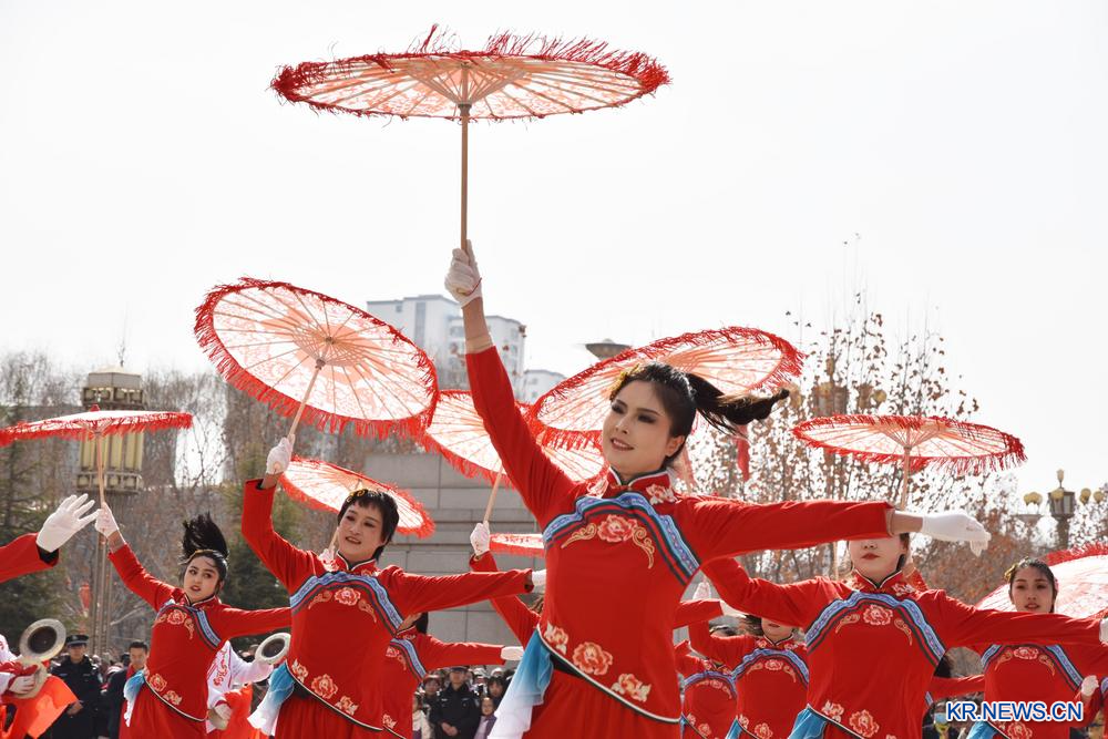 지난달 28일 간쑤(甘肅)성 융징(永靖)현에서 열린 새해맞이 사화(社火·춘절 민간 경축 행사) 공연에서 단원들이 양거(秧歌·중국 북방 농촌 지역의 민간 가무) 를 선보였다.