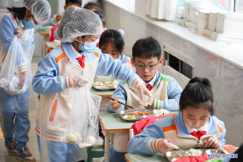 2일 베이징 서우두(首都)사범대학 부속초등학교 교실에서 배식을 맡은 학생들이 만터우(饅頭∙찐빵)를 나눠주고 있다.