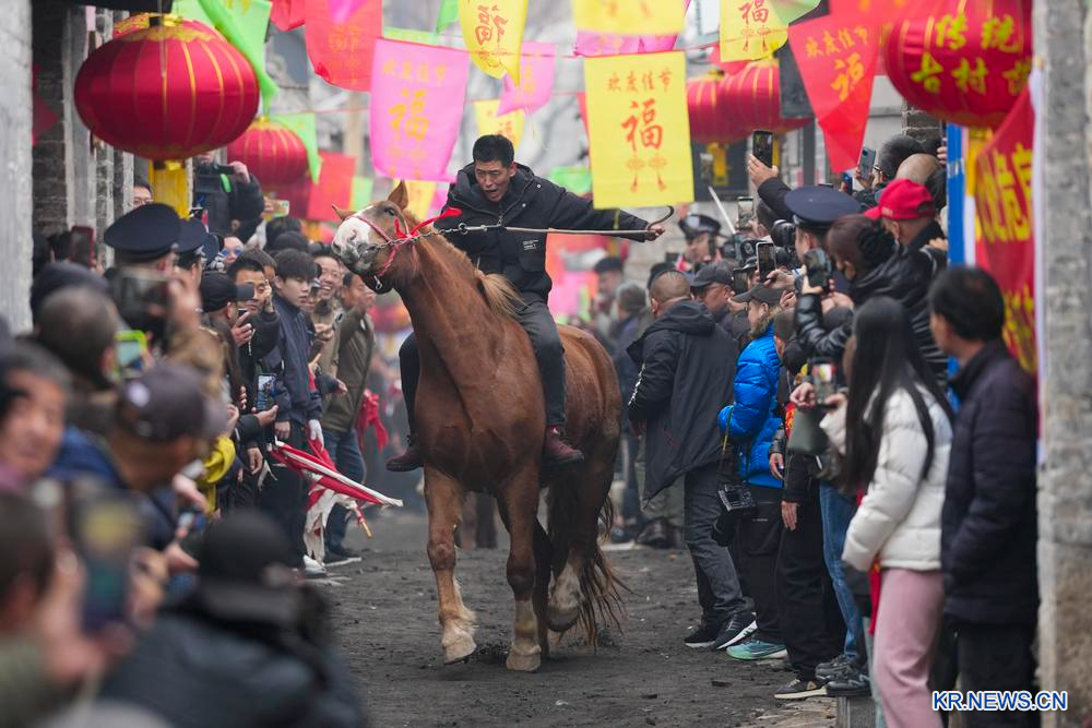 [신화망 중국 핑딩 3월5일] 4일 산시(山西)성 양취안(陽泉)시 샤둥자이(下董寨)촌을 찾은 많은 관광객이 국가급 무형문화유산 프로젝트인 '파오마파이(跑馬排)'를 체험했다. '파오마파이'는 말을 타고 길이 100m 이상, 평균 너비 4m 미만인 오래된 청석(青石) 골목을 달리는 샤둥자이촌의 민속 행사다.