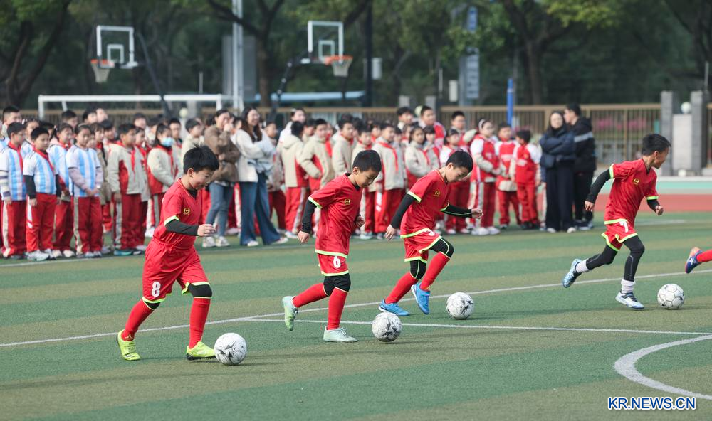 5일 자싱시의 한 초등학교에서 개학 첫 수업으로 축구 연습이 이뤄지고 있다. 2026.3.5pagebreak