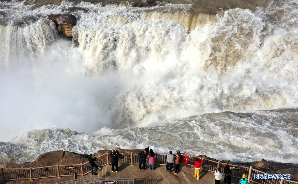 이날 황허 후커우 폭포 관광지를 둘러보고 있는 관광객들을 드론으로 담았다. 2026.3.5
