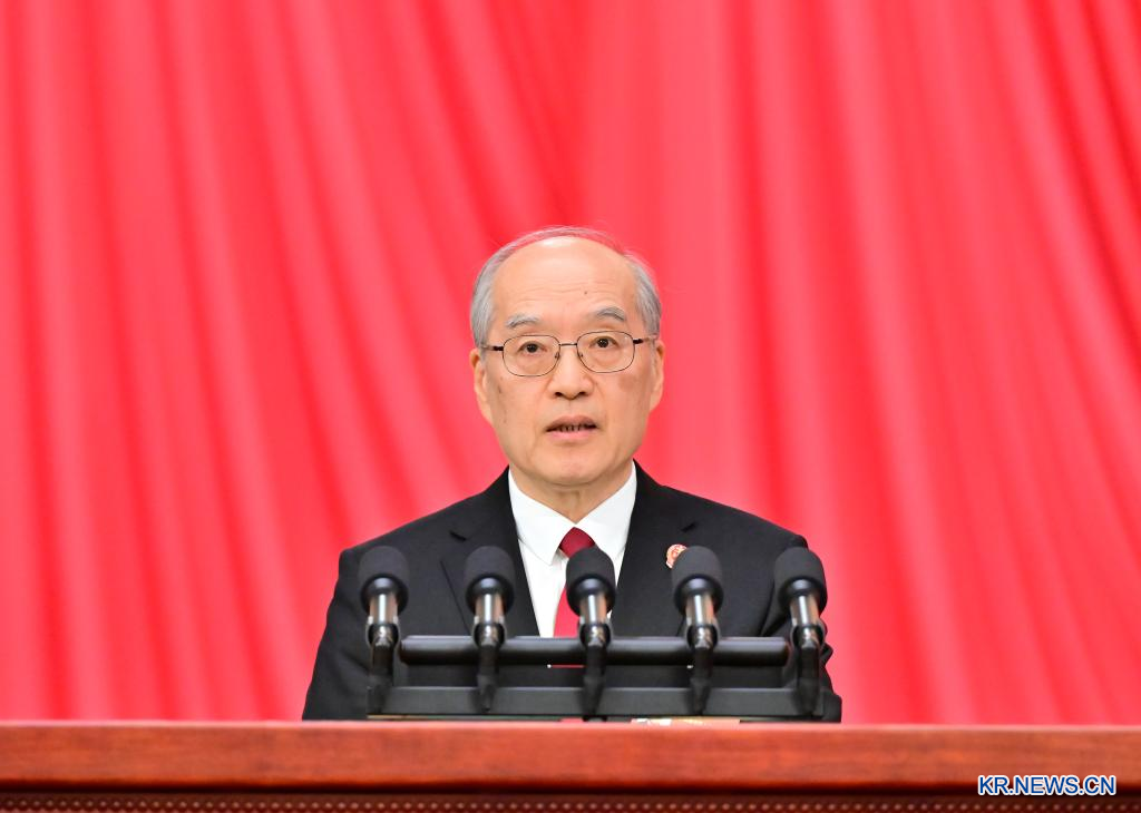 [신화망 베이징 3월9일] 제14기 전국인민대표대회(전인대) 4차 회의는 9일 베이징 인민대회당에서 제2차 전체회의를 열었다.장쥔(張軍) 최고인민법원 원장이 최고인민법원 업무보고를 발표했다.[촬영/신화사 기자 딩하이타오(丁海濤)]