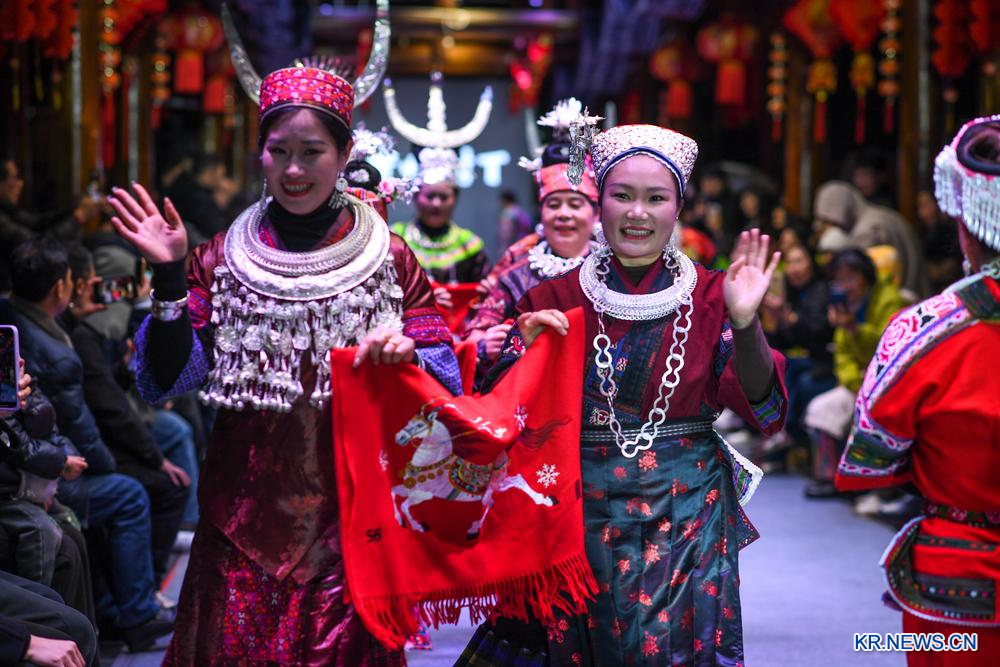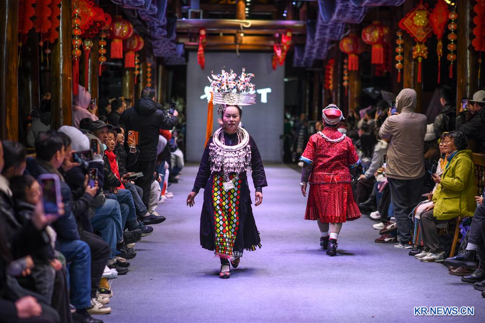 [신화망 중국 카이리 3월10일] 8일 저녁 구이저우(貴州)성 카이리(凱里)시 먀오둥펑칭위안(苗侗風情園)에서 민족의상 패션쇼가 펼쳐졌다. 첸둥난(黔東南)먀오(苗)족둥(侗)족자치주 16개 현·시의 자수 장인과 여성 대표들이 무대에 올라 화려하고 다채로운 민족의상의 아름다움을 뽐냈다.